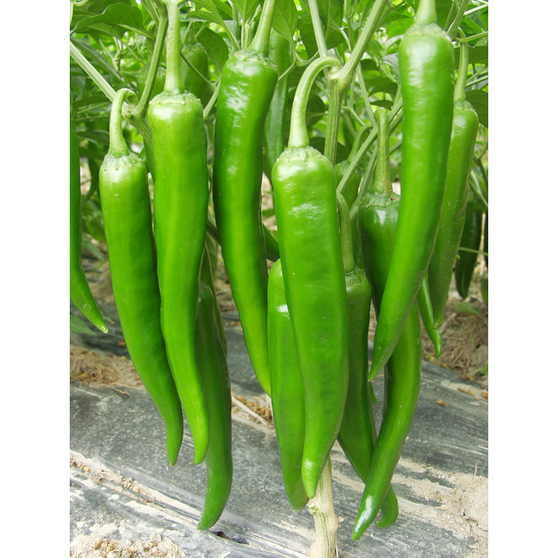 植株生长势中等,叶片小,首花节位10-12节,连续坐果能力强,果实长棒牛角形,果皮绿色,果长19-22cm,果径3.2-3.5cm,果肉厚0.3cm。单果重55-62g,辣味中等,果皮光滑,顺直无皱,果形整齐,耐贮运。耐湿热,抗病毒病,适应性广。