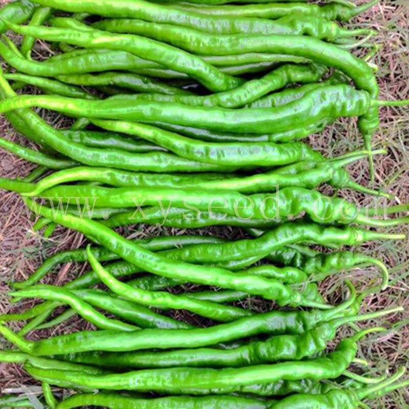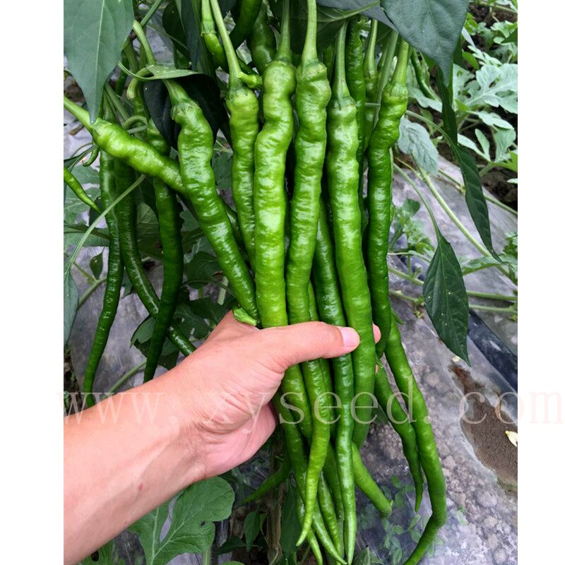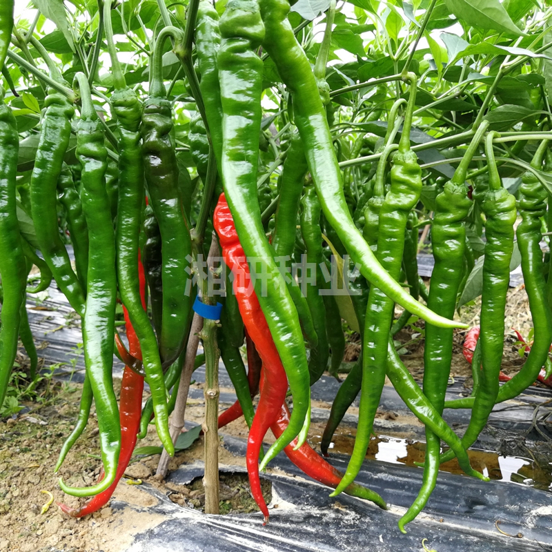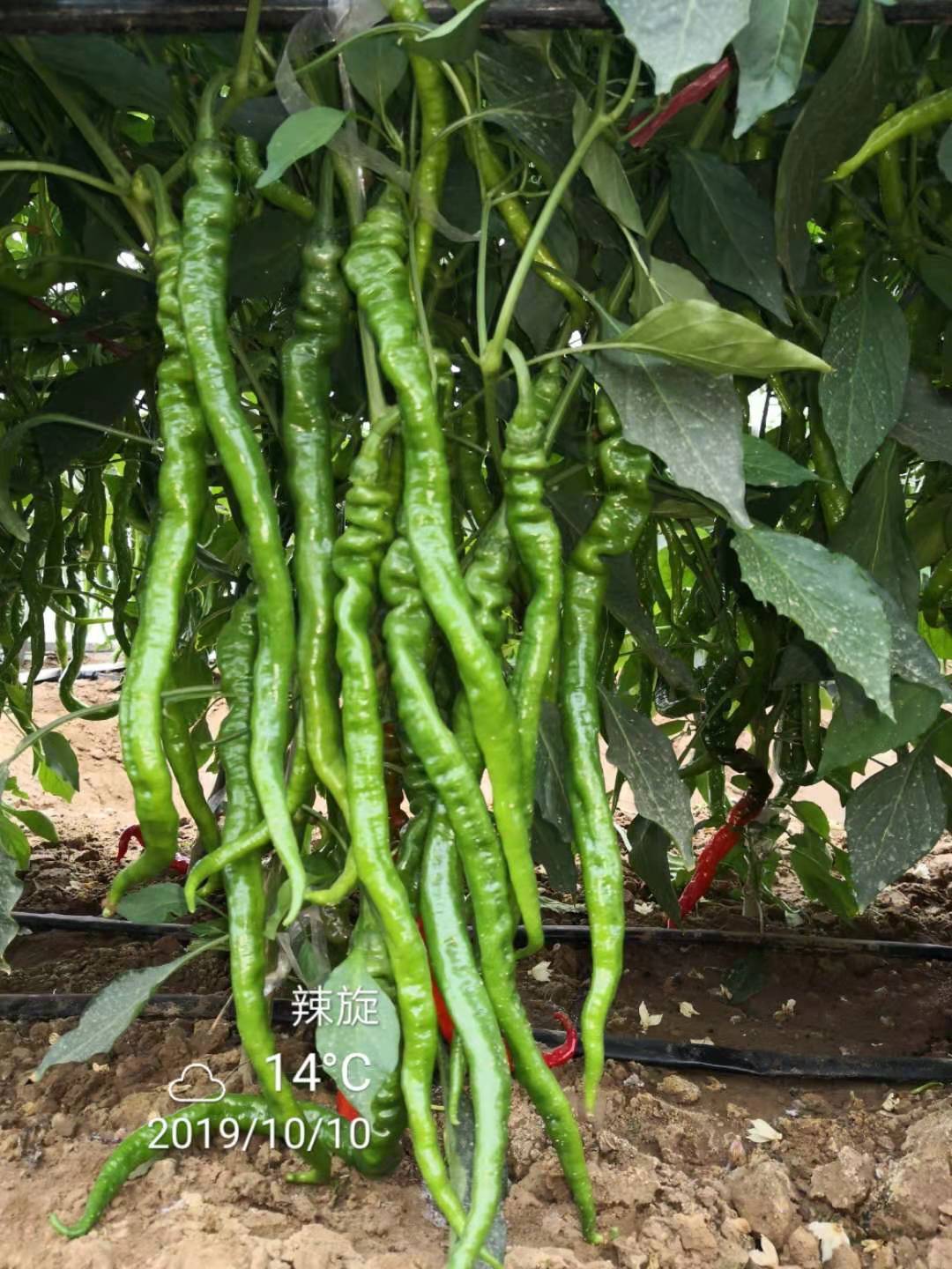 早熟、细长、螺丝线椒品种。植株生长势较强,株型紧凑,分枝多,叶片小,叶色深绿;果实细长,果肩皱,螺旋,果长28-31厘米,果宽约2.0厘米;青熟果深绿色,红熟果红色,光亮,前后期果实一致性好,单果重25克左右,皮薄,味辣,品质好;耐低温寡日照能力强,坐果性好,连续挂果能力强,综合抗性好,适宜早春大棚栽培或秋延后栽培。