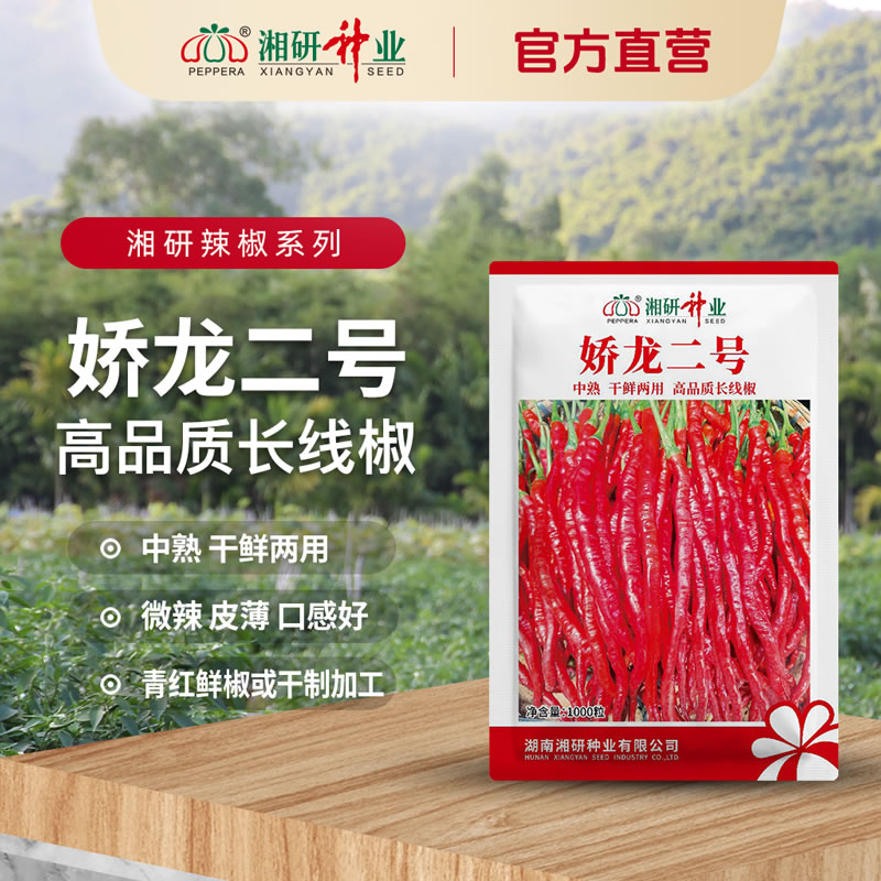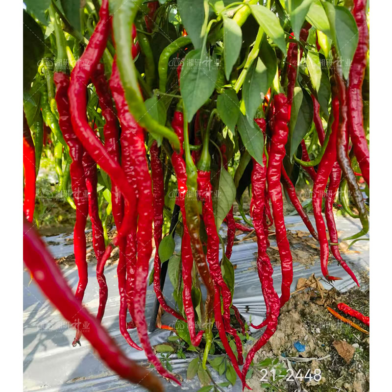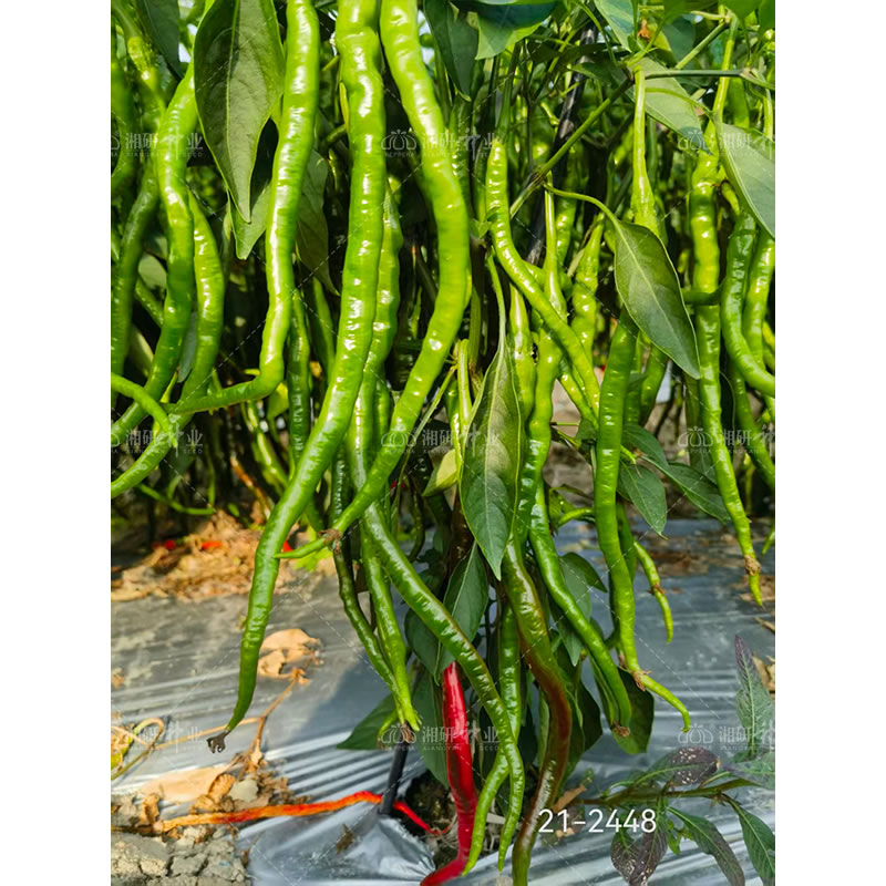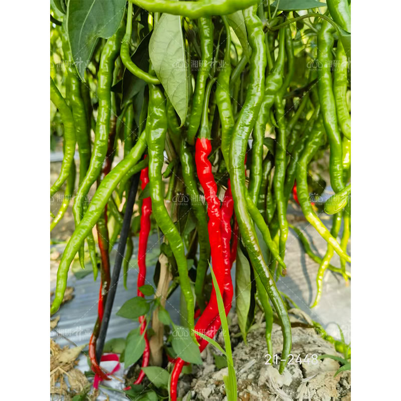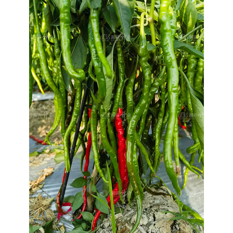 中熟、干鲜两用、高品质长线椒品种,第一花节位约12节,植株生长势较强,株型高大,叶小,株高约71.6cm,株幅约80.8cm。果实绿色转红色,顺直,果长约31.6cm,果宽约1.5cm左右,单果重22.0g左右,味辣,皮薄,肉质脆嫩,品质好,连续坐果性好,综合抗性强,适宜青红鲜椒上市或干制加工。