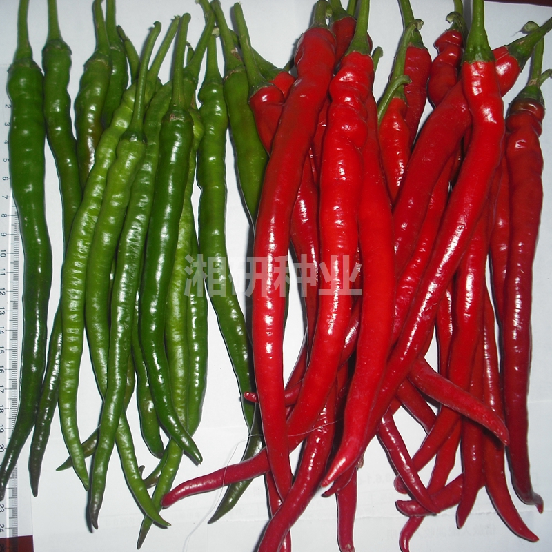 早中熟、长线椒品种。首花节位9-10节,植株生长势强,株型高大、紧凑,节密,叶小,叶色浓绿,株高约65cm,开展度60cm左右,连续坐果性好。果长约26cm,果宽约1.8cm,单果重约24g。果实较直,果表稍皱,果实浅绿色转亮红色,味辣,品质好,耐病毒病能力强。适宜鲜食和酱制加工。